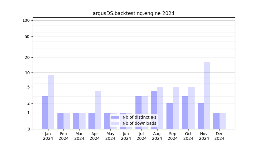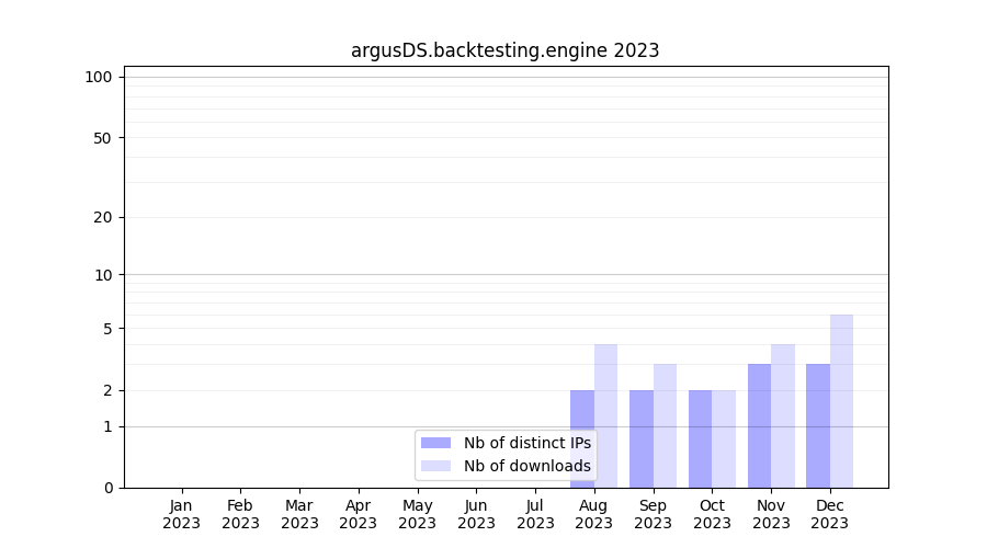 Number of downloads for experiment package argusDS.backtesting.engine, year by year, from 2025 back to 2014 (years with no downloads are omitted):