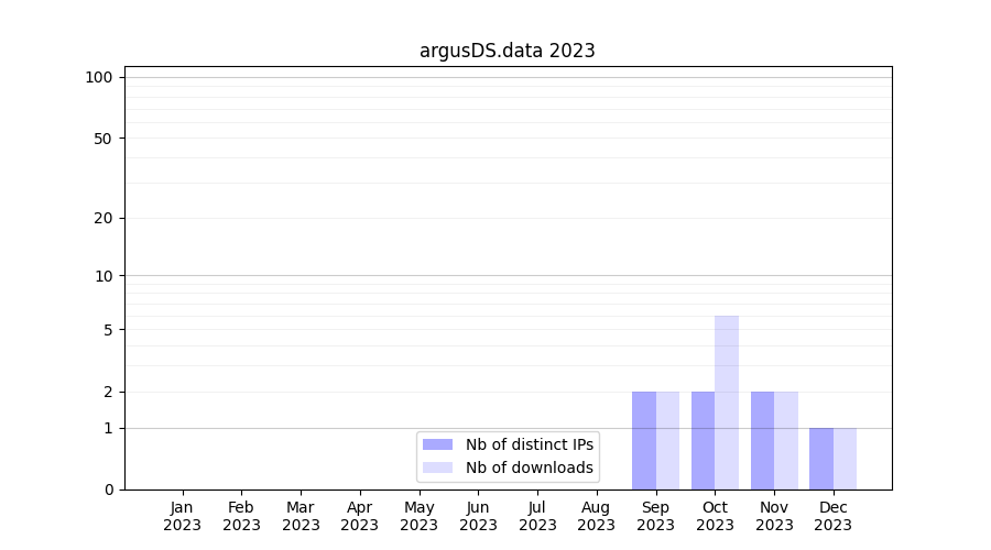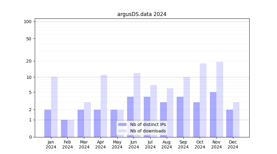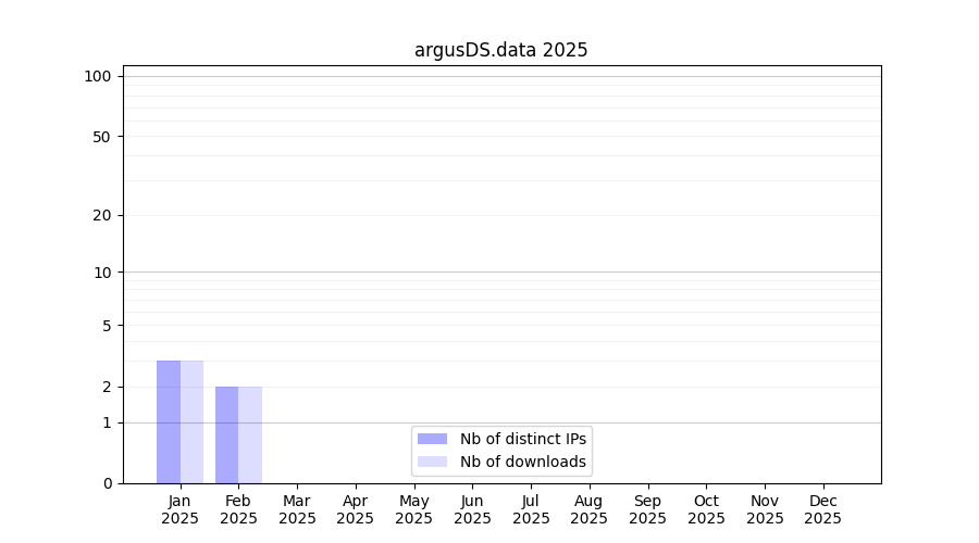 Number of downloads for experiment package argusDS.data, year by year, from 2025 back to 2014 (years with no downloads are omitted):
