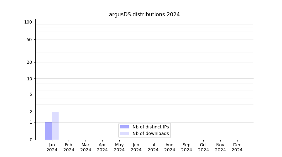 Number of downloads for experiment package argusDS.distributions, year by year, from 2025 back to 2014 (years with no downloads are omitted):