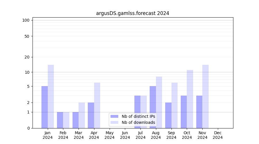 Number of downloads for experiment package argusDS.gamlss.forecast, year by year, from 2025 back to 2014 (years with no downloads are omitted):