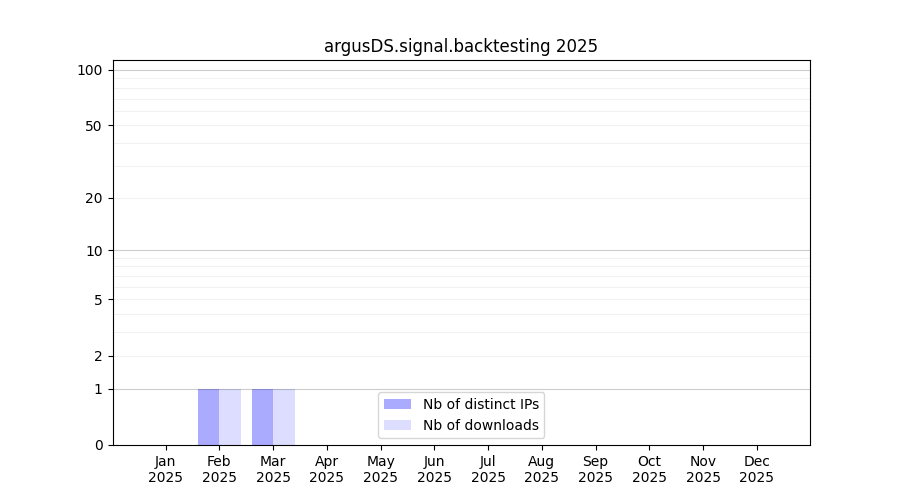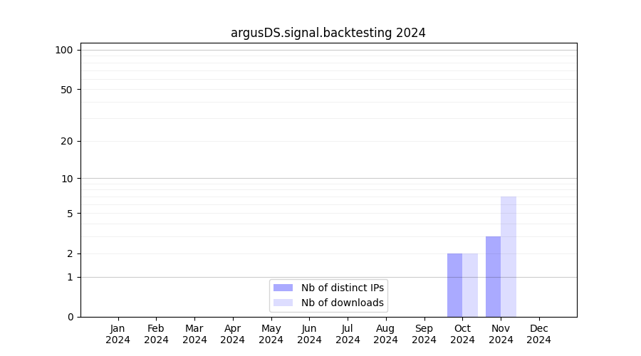 Number of downloads for experiment package argusDS.signal.backtesting, year by year, from 2025 back to 2014 (years with no downloads are omitted):
