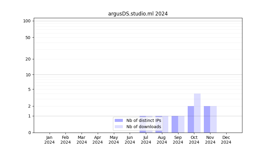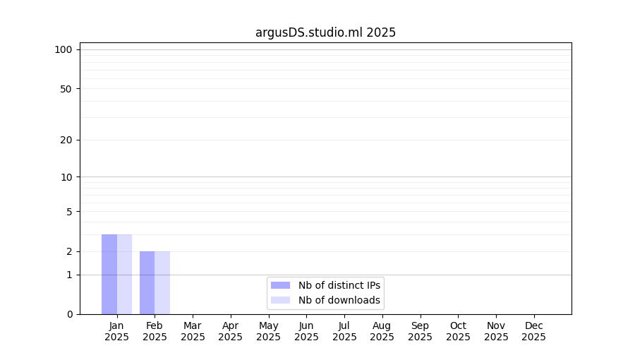 Number of downloads for experiment package argusDS.studio.ml, year by year, from 2025 back to 2014 (years with no downloads are omitted):
