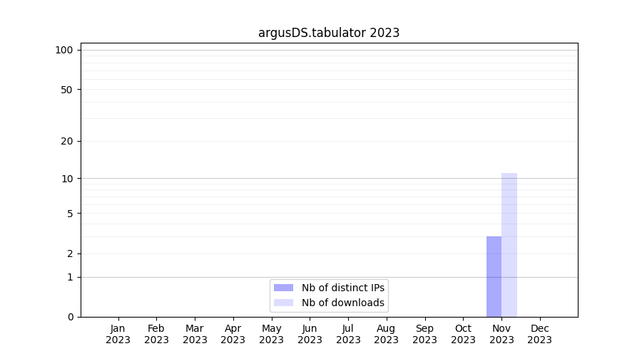 Number of downloads for experiment package argusDS.tabulator, year by year, from 2025 back to 2014 (years with no downloads are omitted):