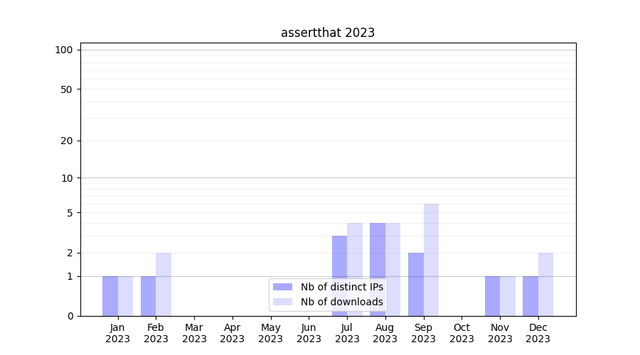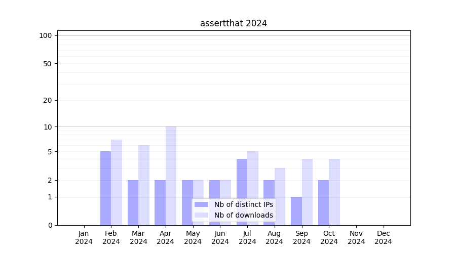 Number of downloads for experiment package assertthat, year by year, from 2025 back to 2014 (years with no downloads are omitted):