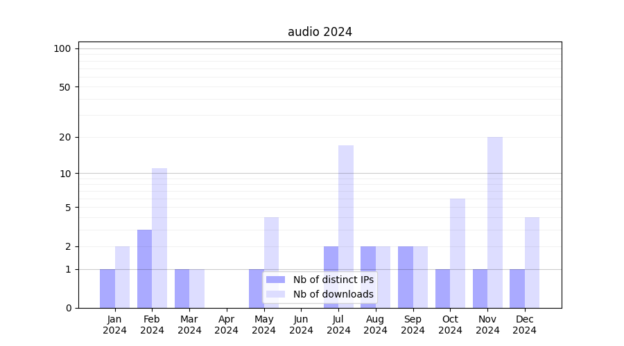 Number of downloads for experiment package audio, year by year, from 2025 back to 2014 (years with no downloads are omitted):