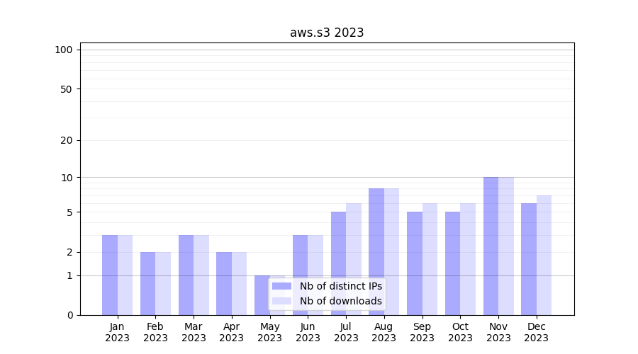 Number of downloads for experiment package aws.s3, year by year, from 2025 back to 2014 (years with no downloads are omitted):