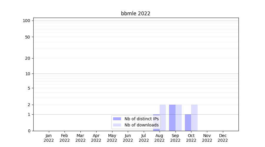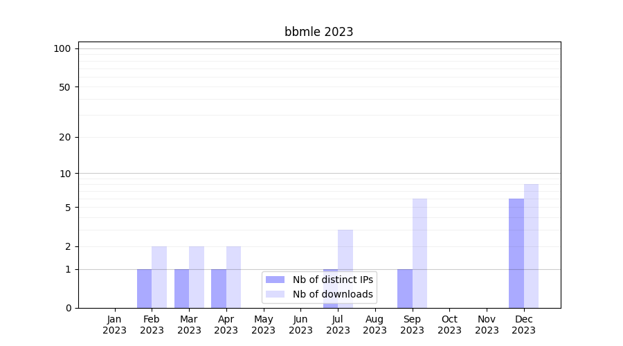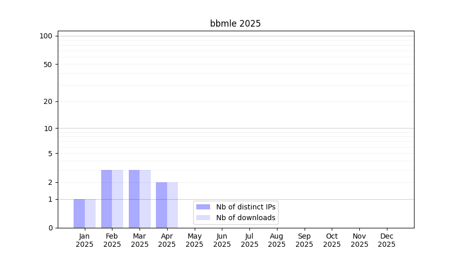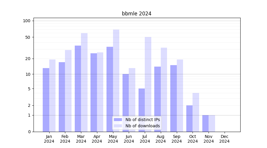 Number of downloads for experiment package bbmle, year by year, from 2025 back to 2014 (years with no downloads are omitted):