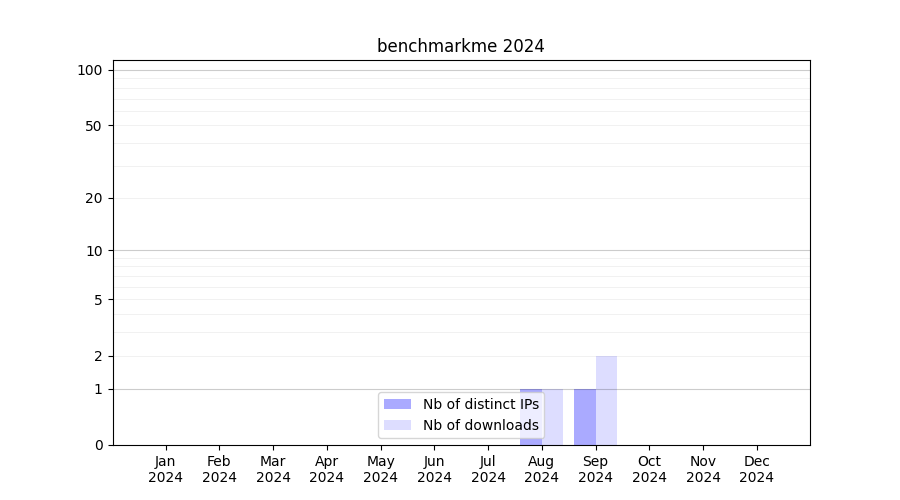 Number of downloads for experiment package benchmarkme, year by year, from 2025 back to 2014 (years with no downloads are omitted):