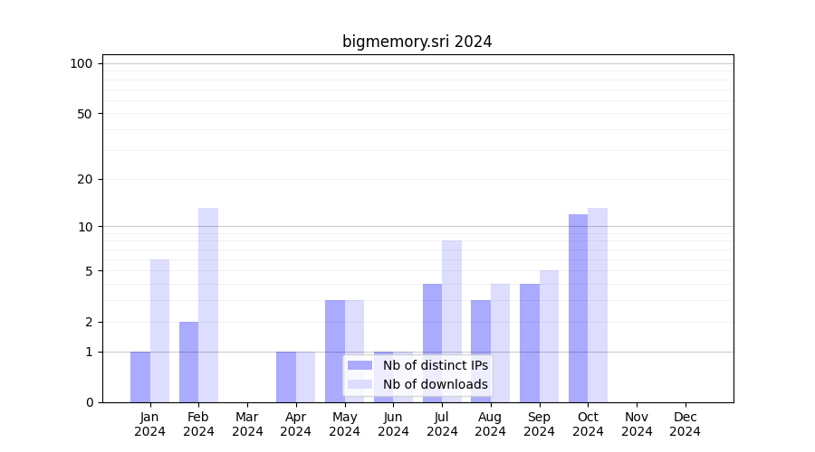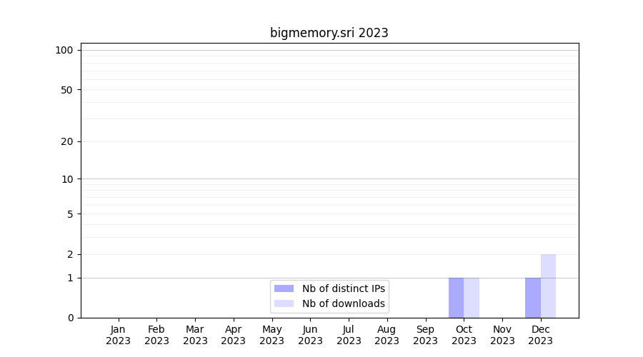 Number of downloads for experiment package bigmemory.sri, year by year, from 2025 back to 2014 (years with no downloads are omitted):