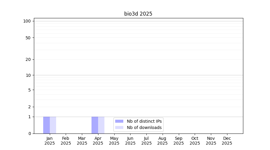 Number of downloads for experiment package bio3d, year by year, from 2025 back to 2014 (years with no downloads are omitted):