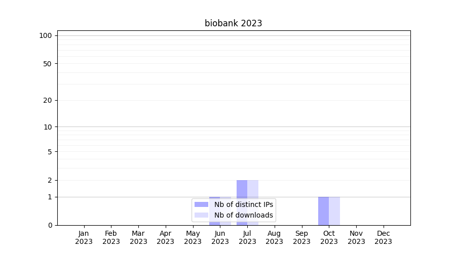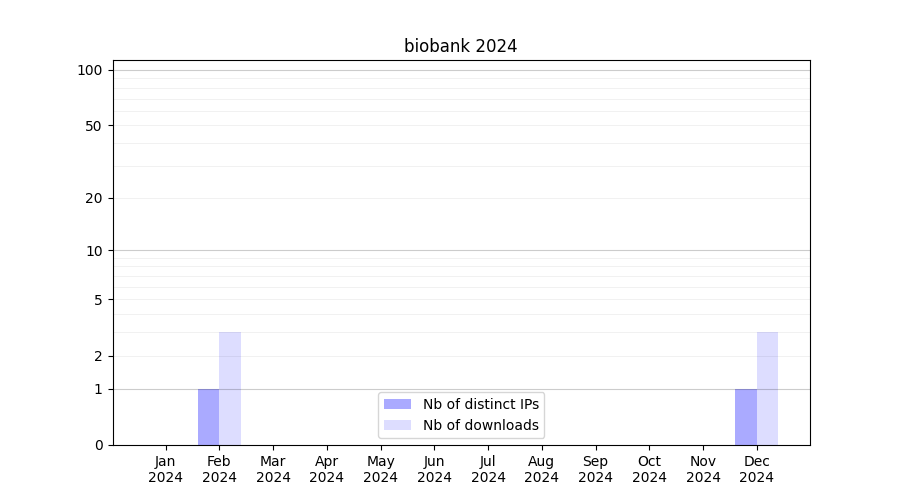 Number of downloads for experiment package biobank, year by year, from 2025 back to 2014 (years with no downloads are omitted):