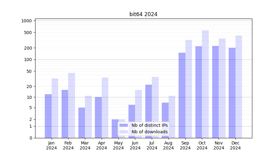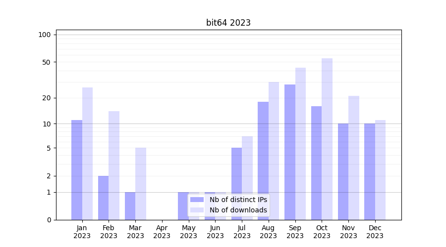 Number of downloads for experiment package bit64, year by year, from 2025 back to 2014 (years with no downloads are omitted):