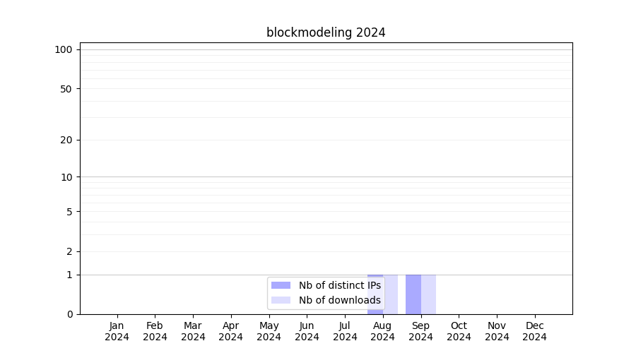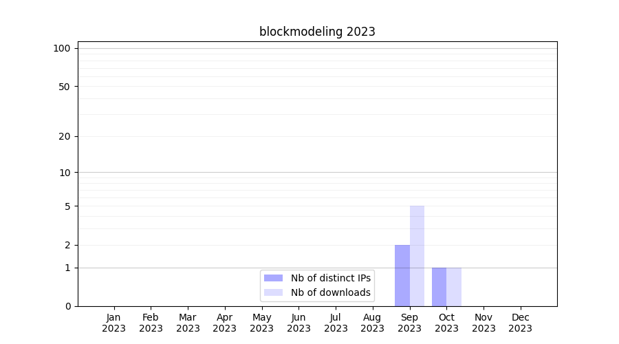 Number of downloads for experiment package blockmodeling, year by year, from 2025 back to 2014 (years with no downloads are omitted):