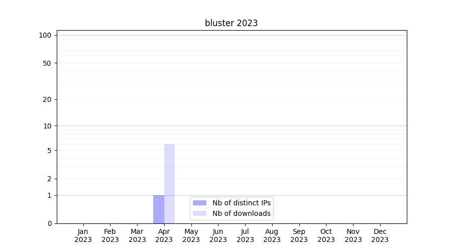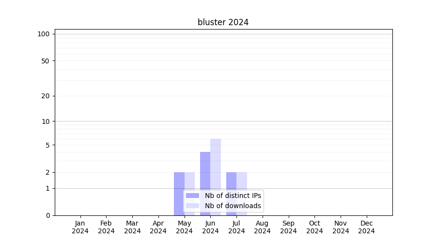 Number of downloads for experiment package bluster, year by year, from 2025 back to 2014 (years with no downloads are omitted):