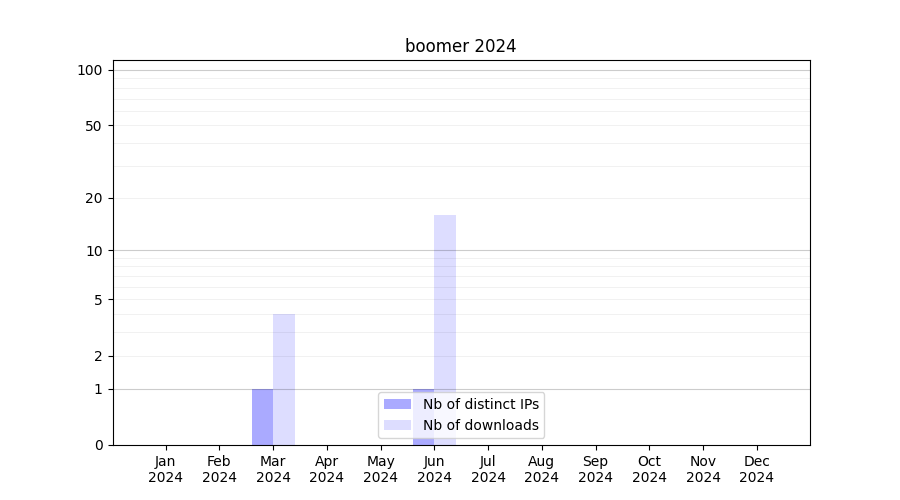 Number of downloads for experiment package boomer, year by year, from 2025 back to 2014 (years with no downloads are omitted):