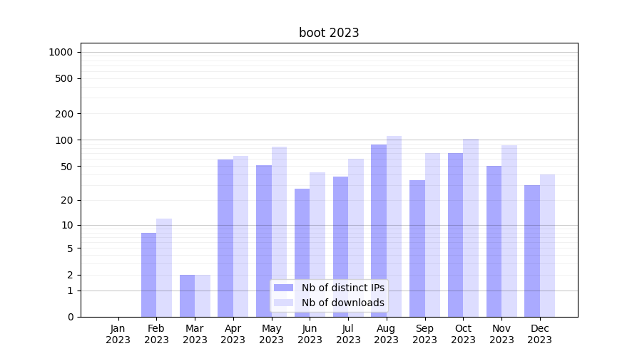 Number of downloads for experiment package boot, year by year, from 2025 back to 2014 (years with no downloads are omitted):