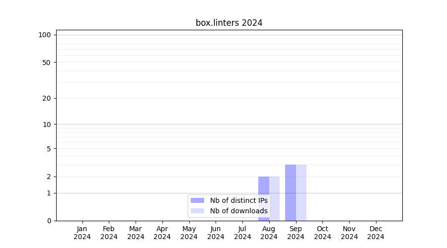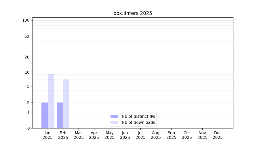 Number of downloads for experiment package box.linters, year by year, from 2025 back to 2014 (years with no downloads are omitted):