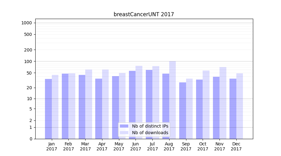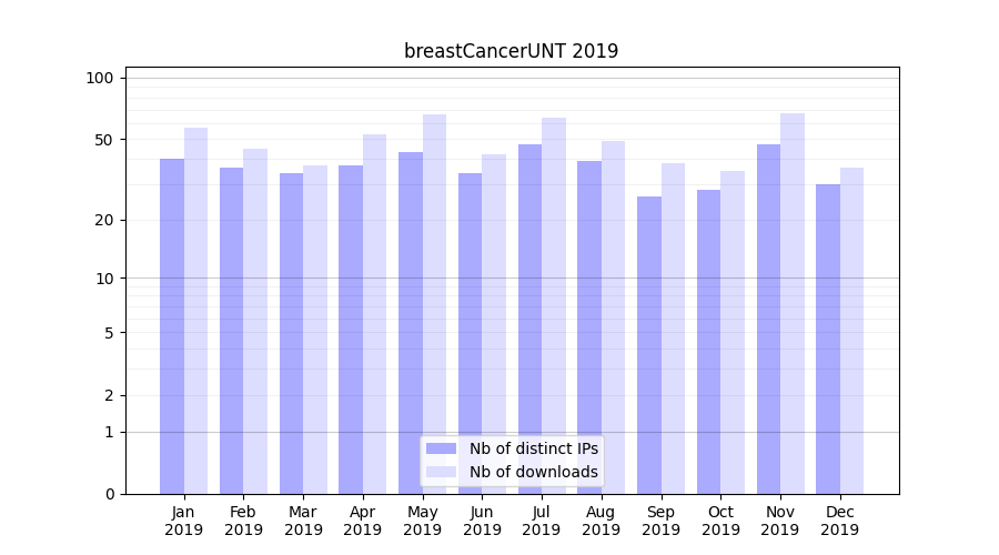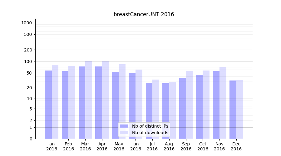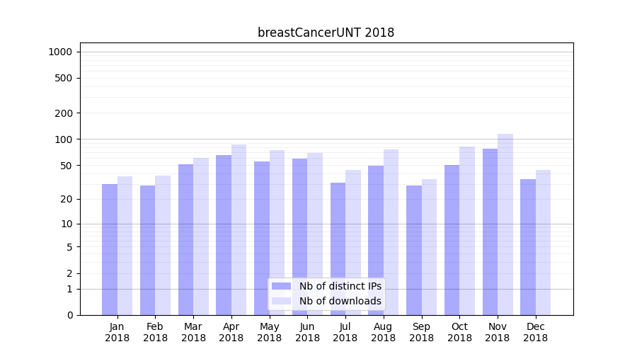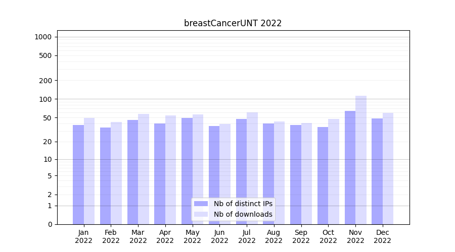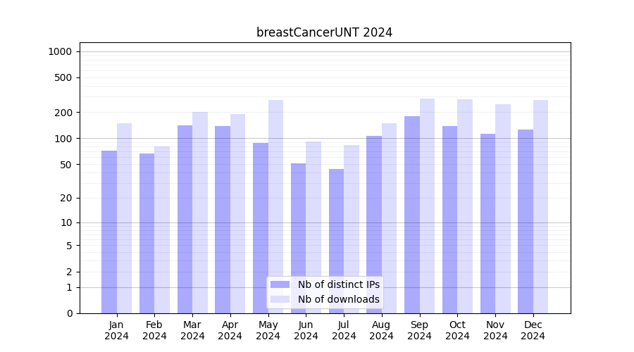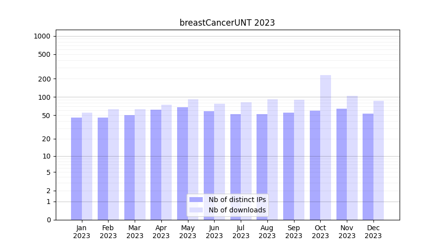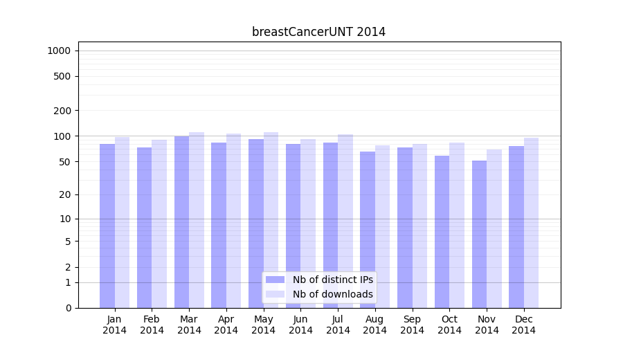 Number of downloads for experiment package breastCancerUNT, year by year, from 2025 back to 2014 (years with no downloads are omitted):
