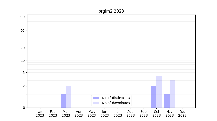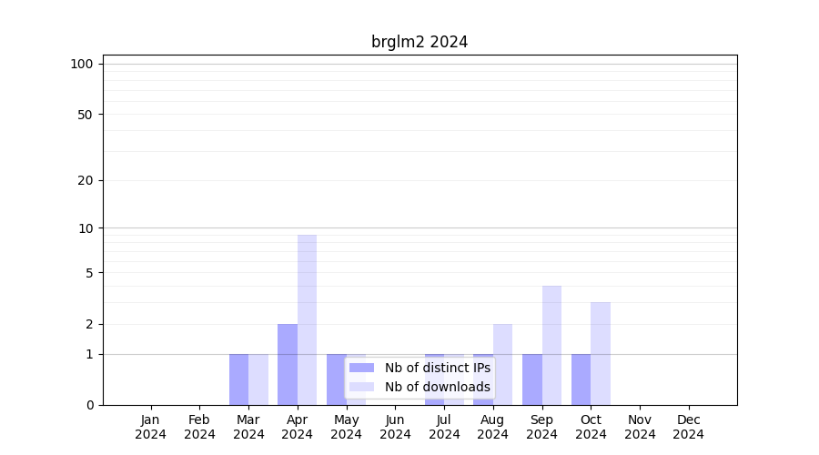 Number of downloads for experiment package brglm2, year by year, from 2025 back to 2014 (years with no downloads are omitted):