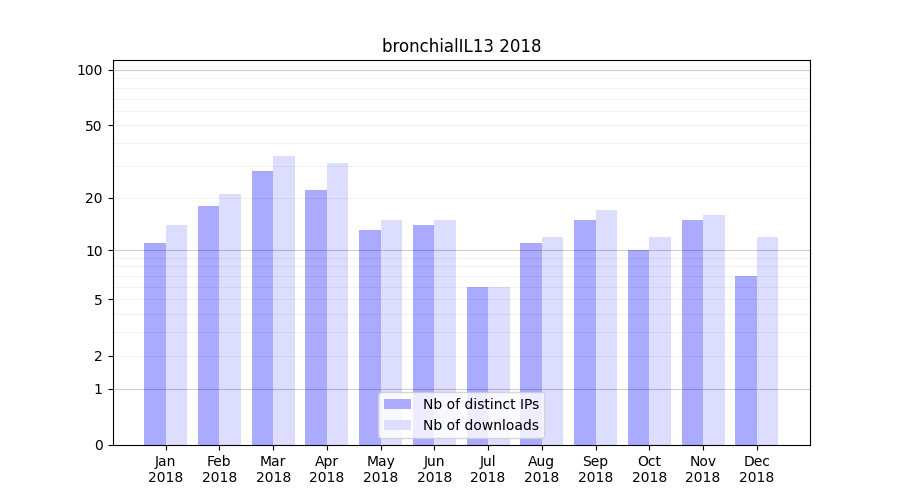 Number of downloads for experiment package bronchialIL13, year by year, from 2025 back to 2014 (years with no downloads are omitted):