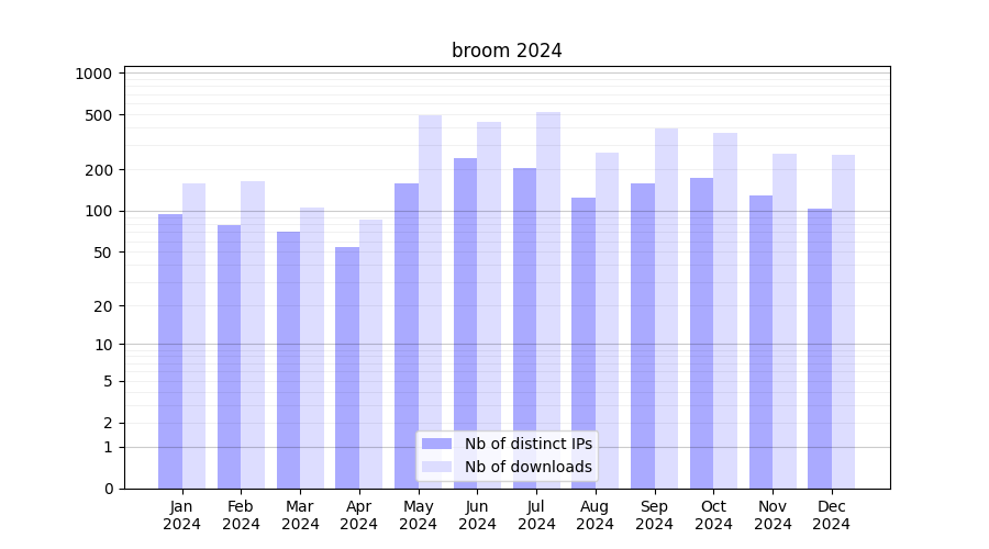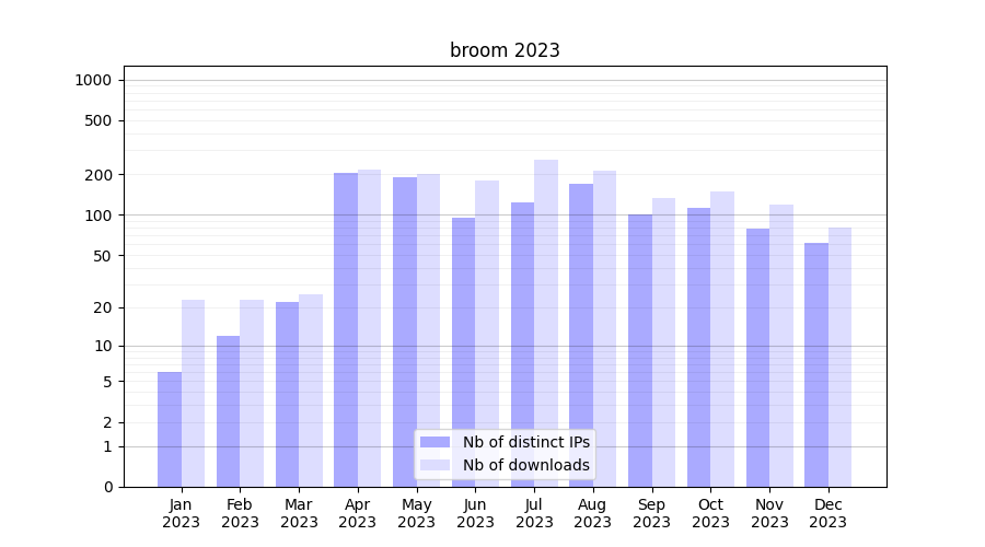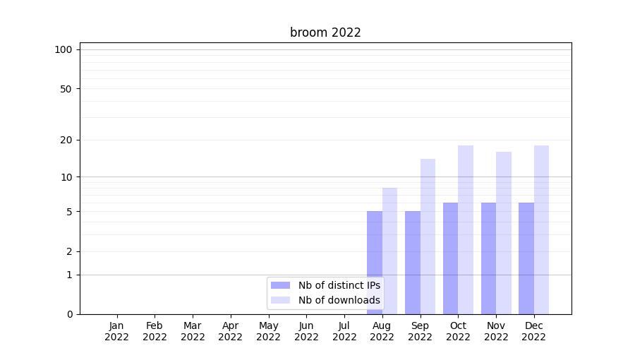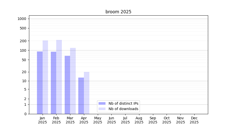 Number of downloads for experiment package broom, year by year, from 2025 back to 2014 (years with no downloads are omitted):
