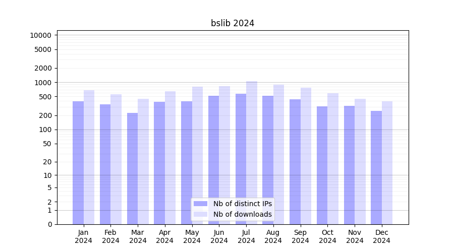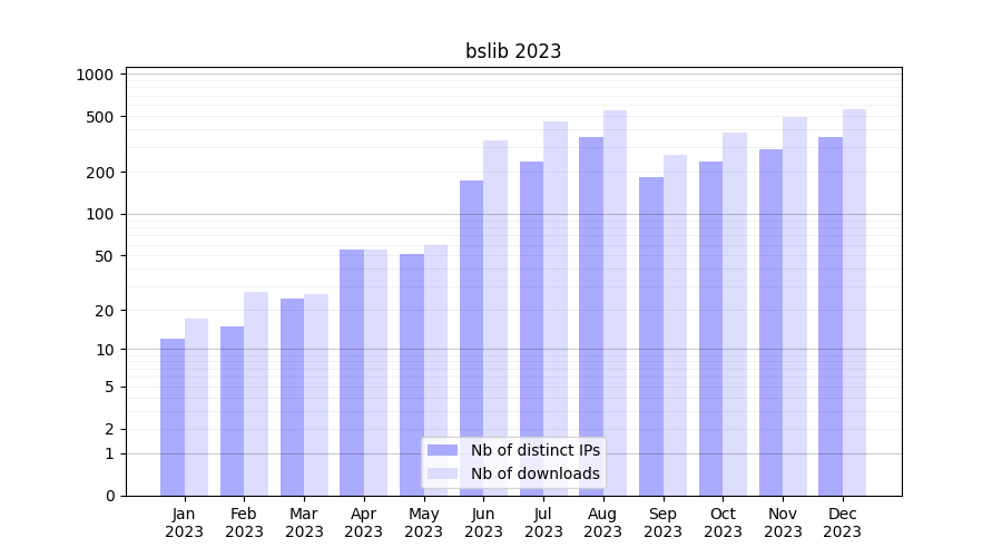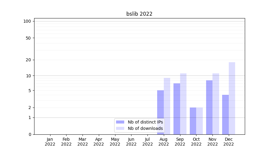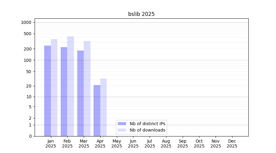 Number of downloads for experiment package bslib, year by year, from 2025 back to 2014 (years with no downloads are omitted):