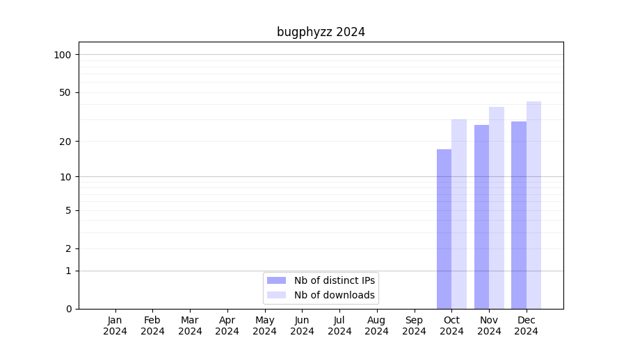 Number of downloads for experiment package bugphyzz, year by year, from 2025 back to 2014 (years with no downloads are omitted):