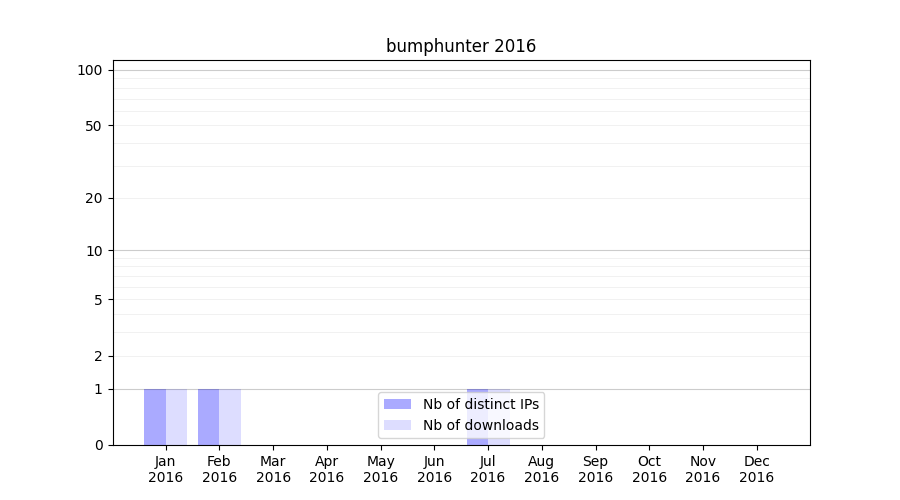 Number of downloads for experiment package bumphunter, year by year, from 2025 back to 2014 (years with no downloads are omitted):