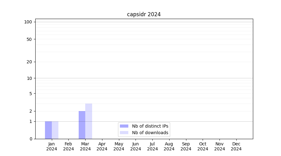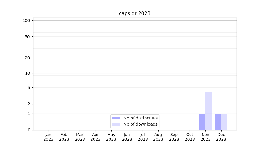 Number of downloads for experiment package capsidr, year by year, from 2025 back to 2014 (years with no downloads are omitted):
