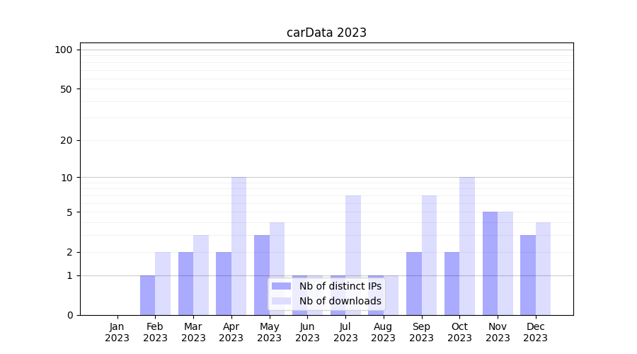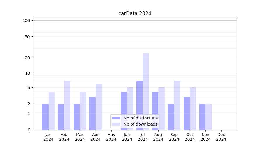 Number of downloads for experiment package carData, year by year, from 2025 back to 2014 (years with no downloads are omitted):