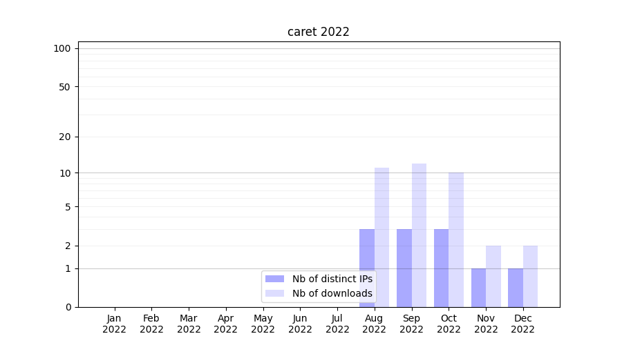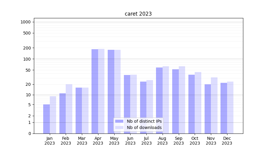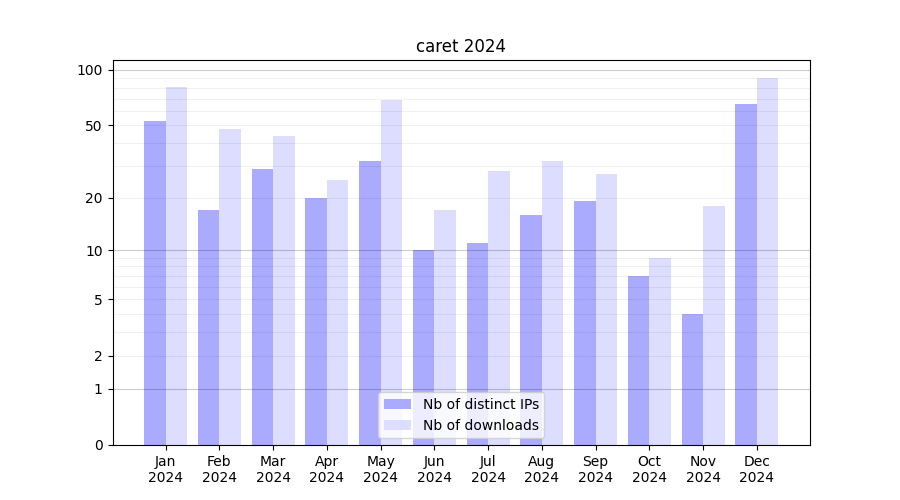 Number of downloads for experiment package caret, year by year, from 2025 back to 2014 (years with no downloads are omitted):