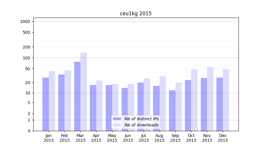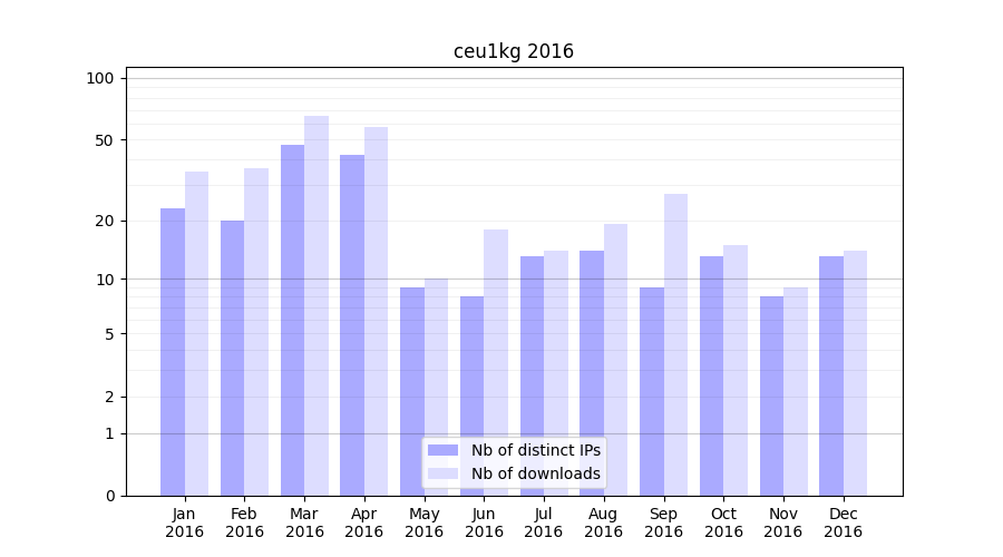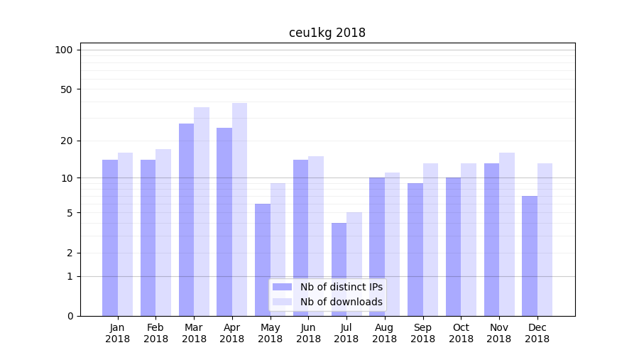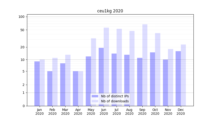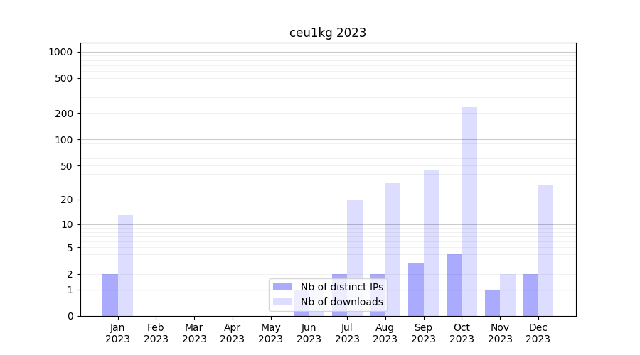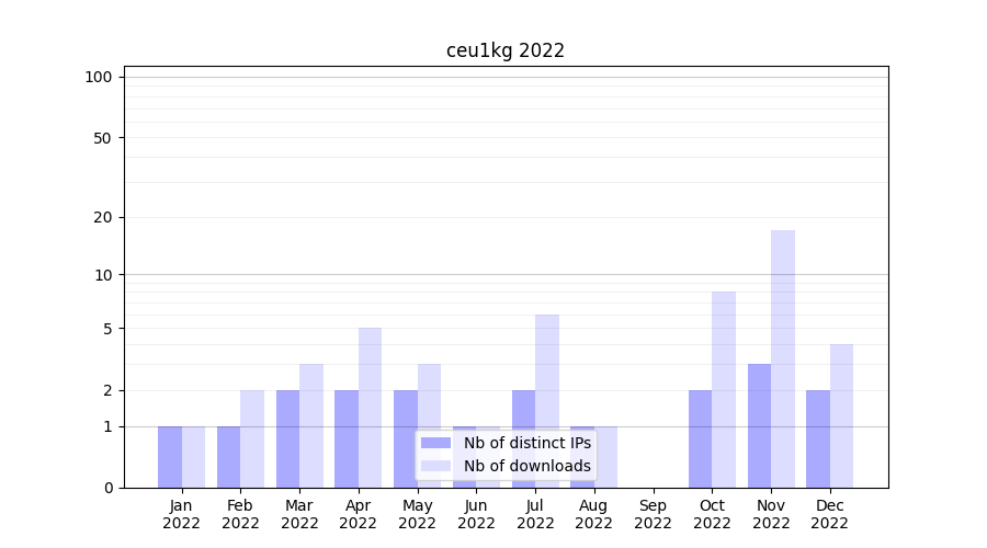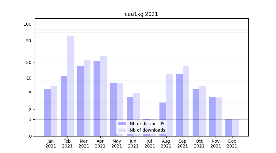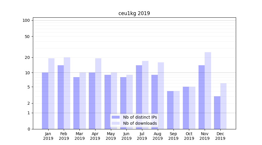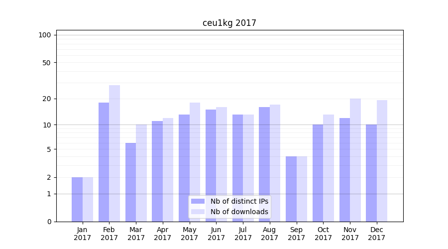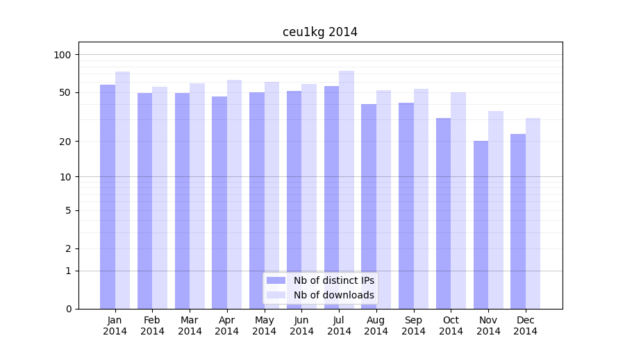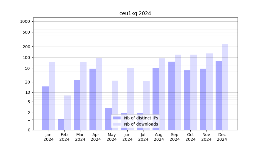 Number of downloads for experiment package ceu1kg, year by year, from 2025 back to 2014 (years with no downloads are omitted):
