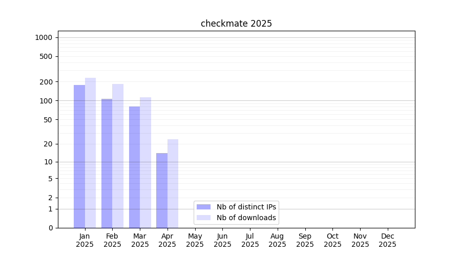Number of downloads for experiment package checkmate, year by year, from 2025 back to 2014 (years with no downloads are omitted):