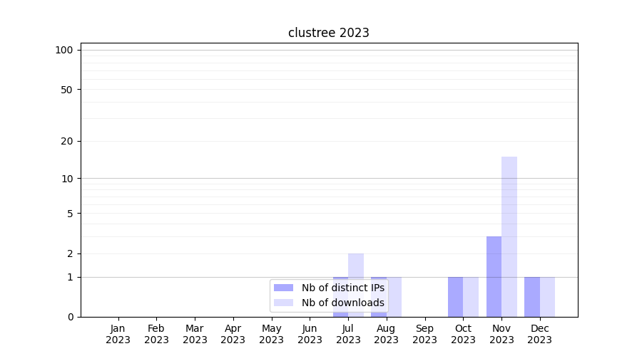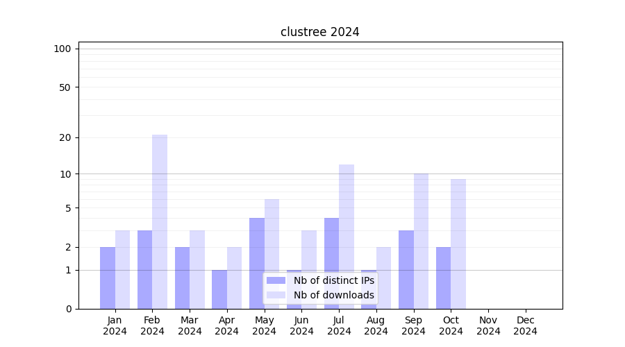 Number of downloads for experiment package clustree, year by year, from 2025 back to 2014 (years with no downloads are omitted):
