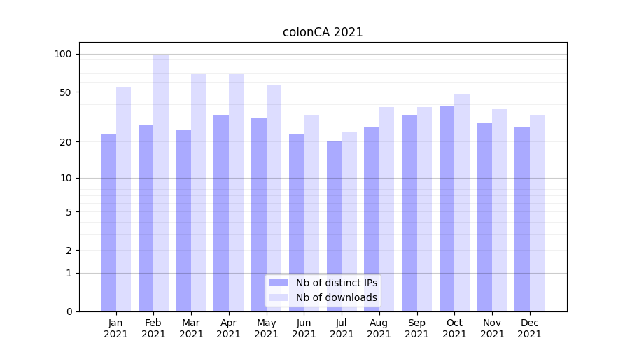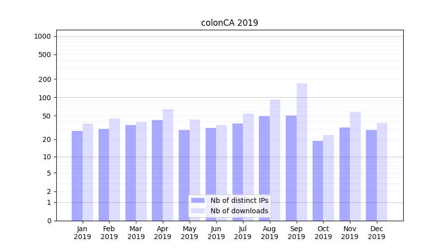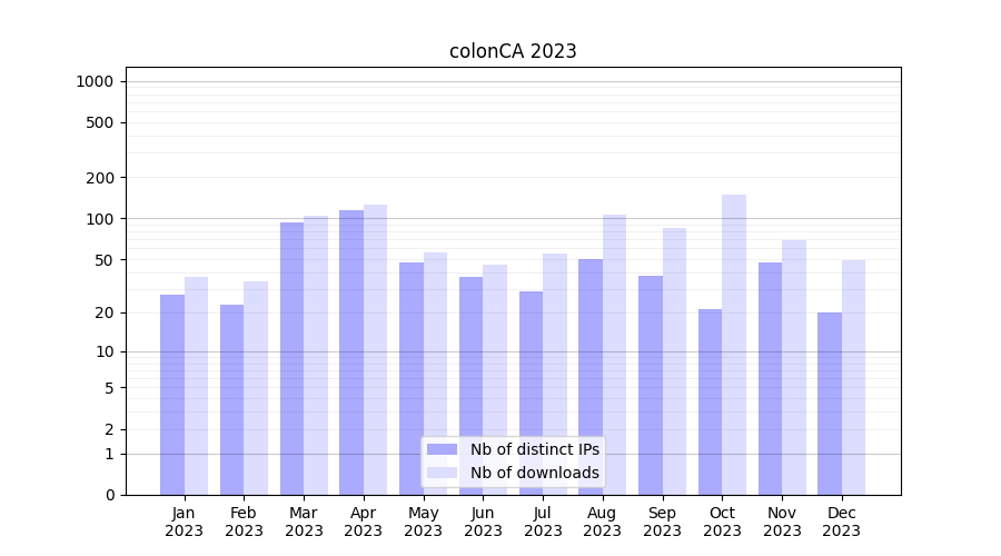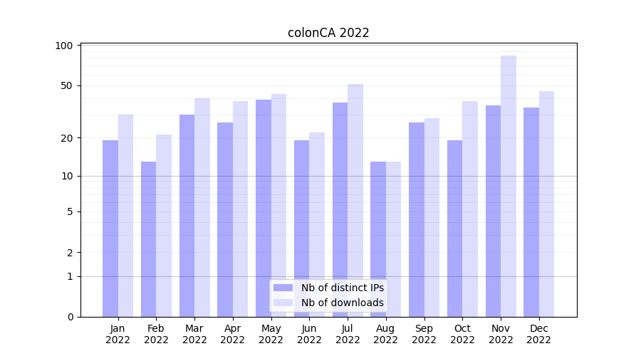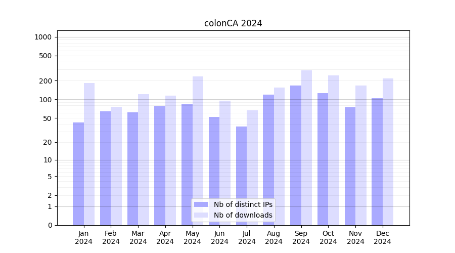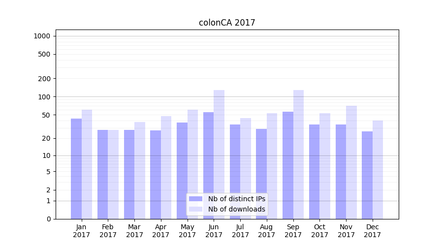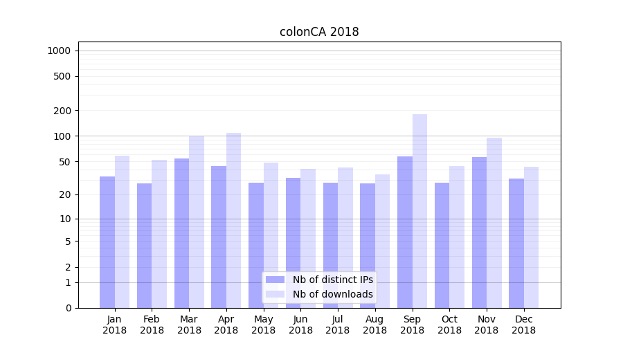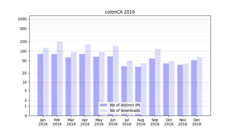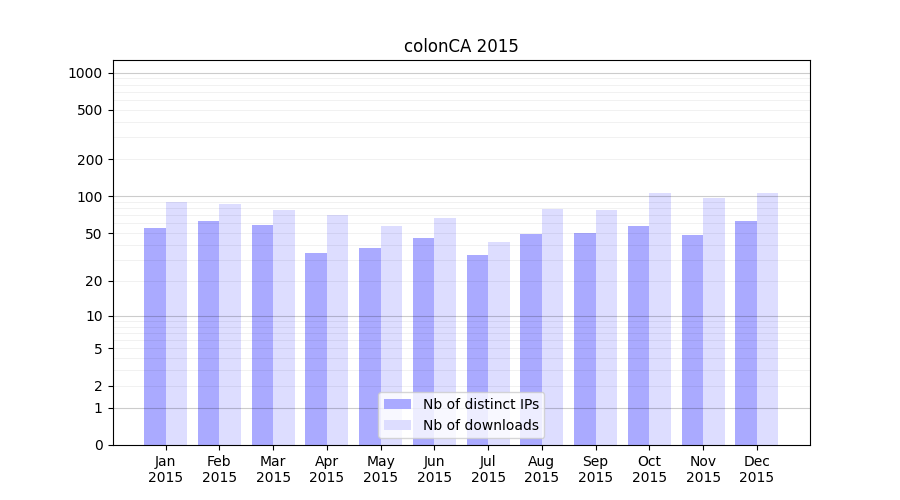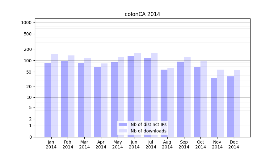 Number of downloads for experiment package colonCA, year by year, from 2025 back to 2014 (years with no downloads are omitted):