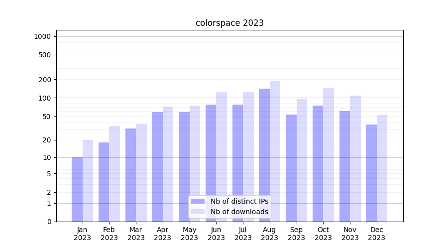Number of downloads for experiment package colorspace, year by year, from 2025 back to 2014 (years with no downloads are omitted):