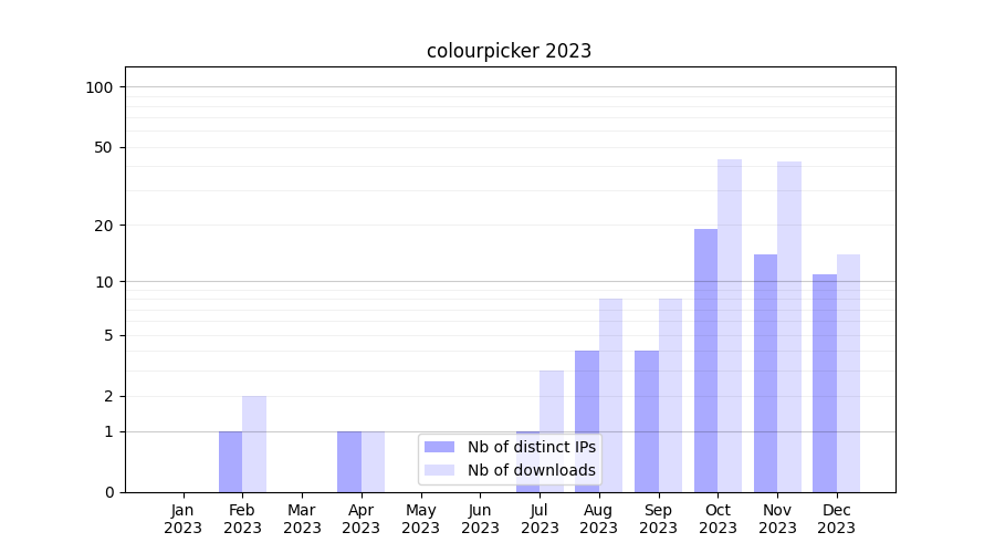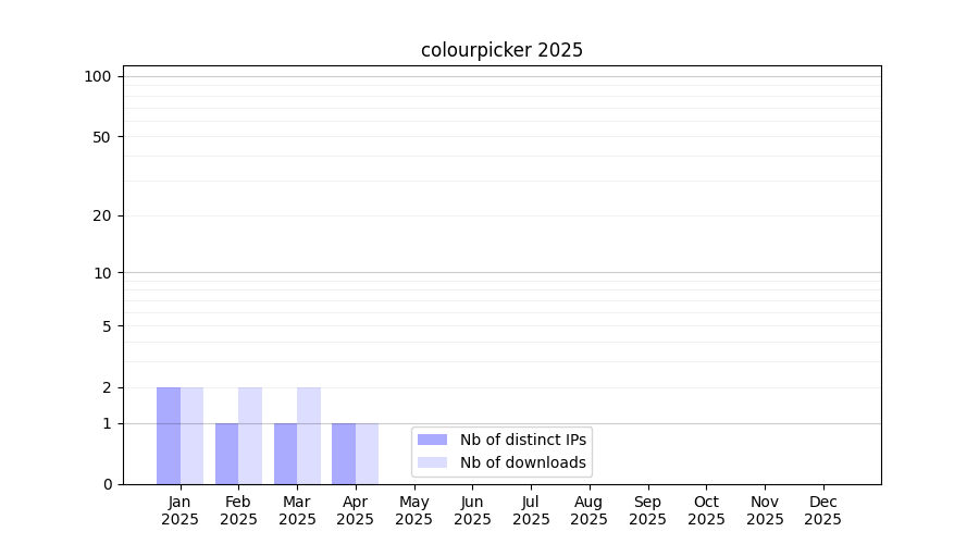 Number of downloads for experiment package colourpicker, year by year, from 2025 back to 2014 (years with no downloads are omitted):