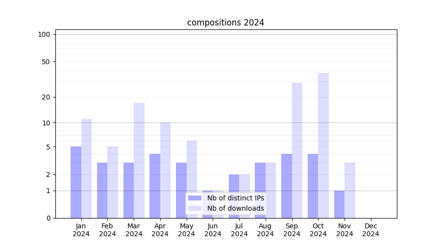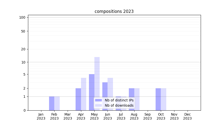 Number of downloads for experiment package compositions, year by year, from 2025 back to 2014 (years with no downloads are omitted):