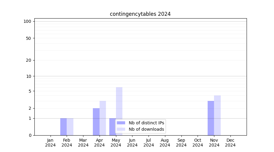 Number of downloads for experiment package contingencytables, year by year, from 2025 back to 2014 (years with no downloads are omitted):