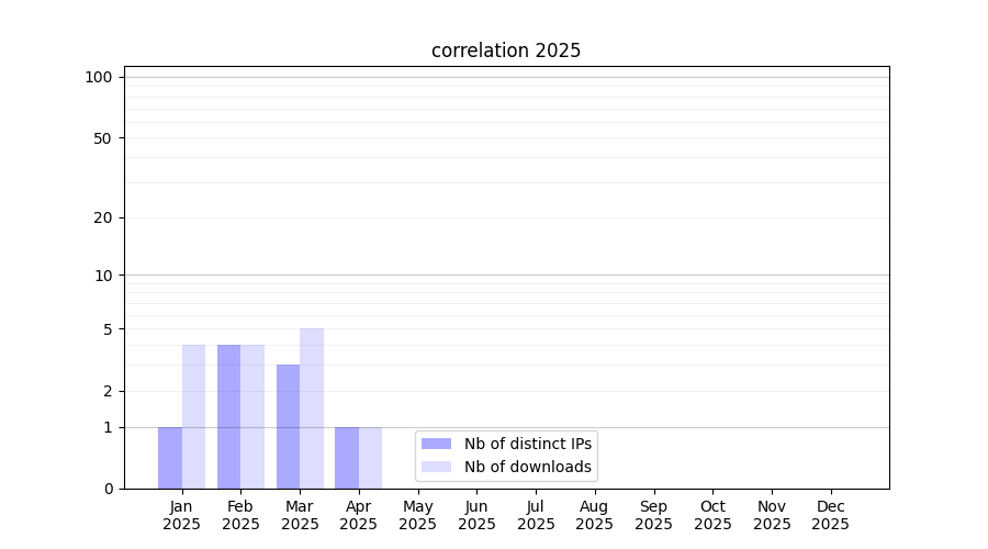 Number of downloads for experiment package correlation, year by year, from 2025 back to 2014 (years with no downloads are omitted):