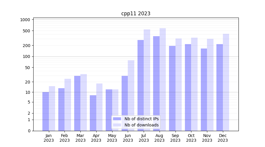 Number of downloads for experiment package cpp11, year by year, from 2025 back to 2014 (years with no downloads are omitted):