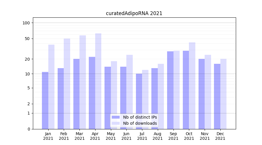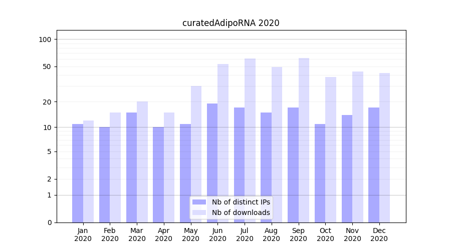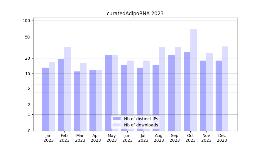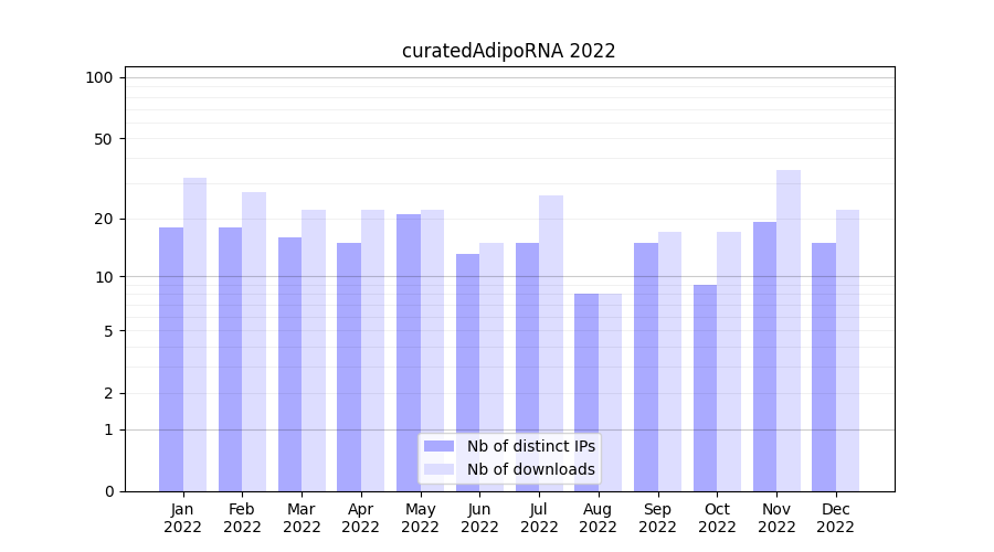 Number of downloads for experiment package curatedAdipoRNA, year by year, from 2025 back to 2014 (years with no downloads are omitted):