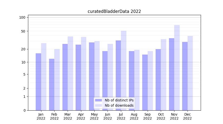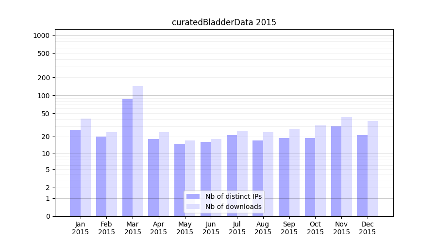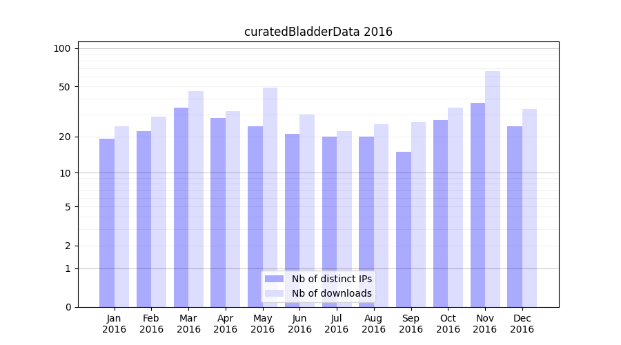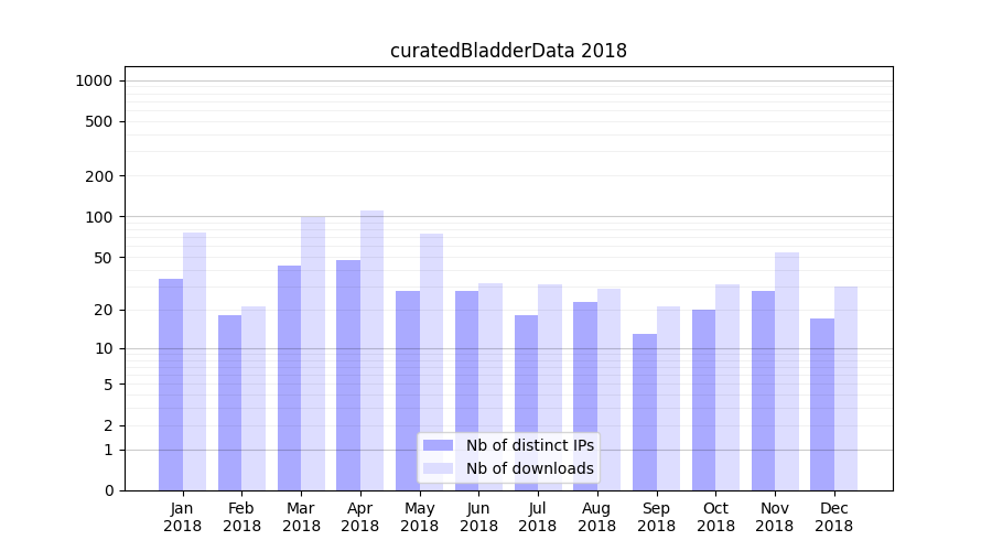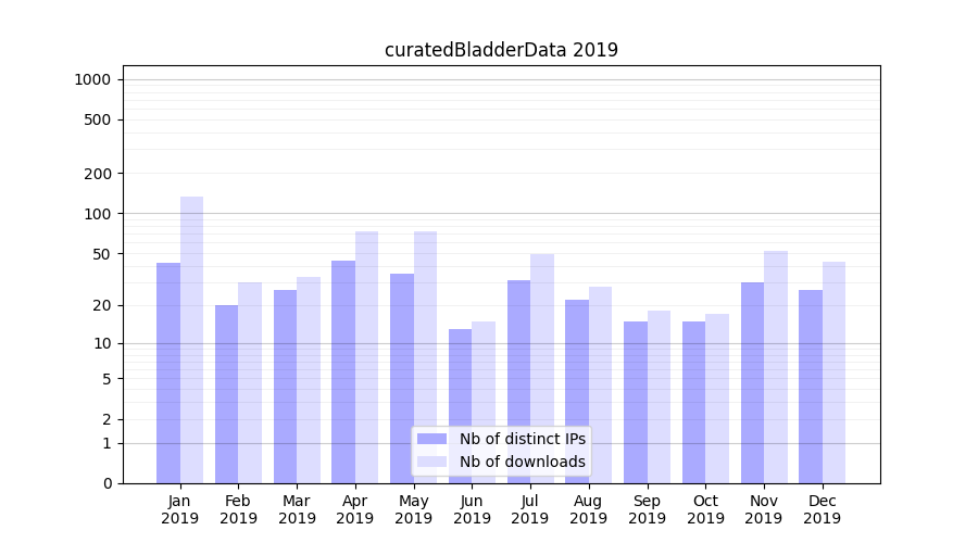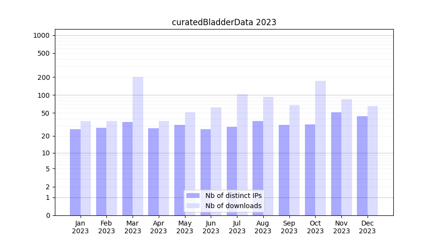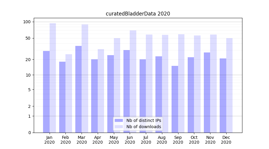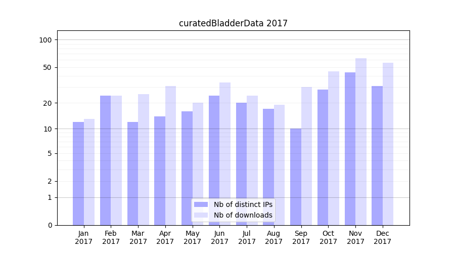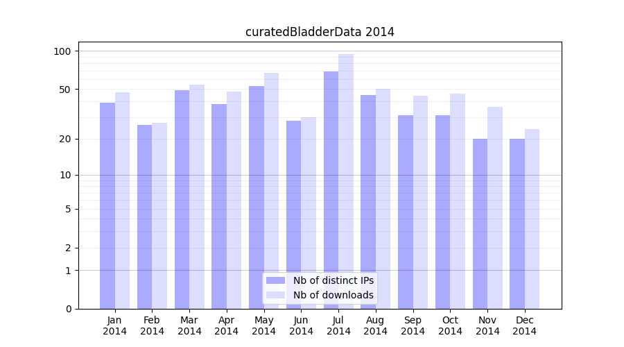 Number of downloads for experiment package curatedBladderData, year by year, from 2025 back to 2014 (years with no downloads are omitted):