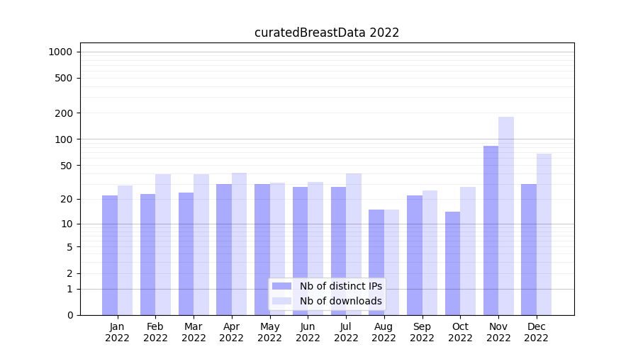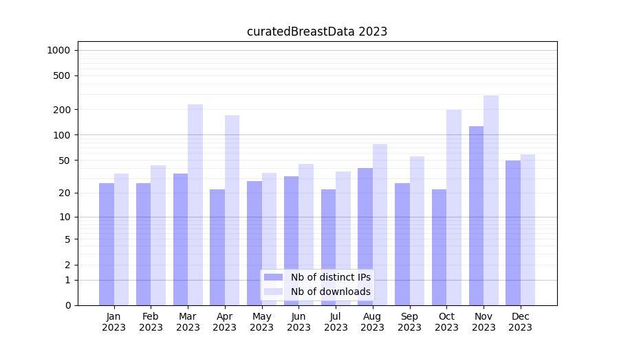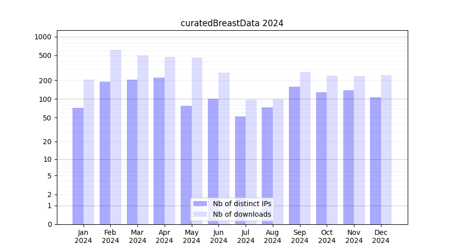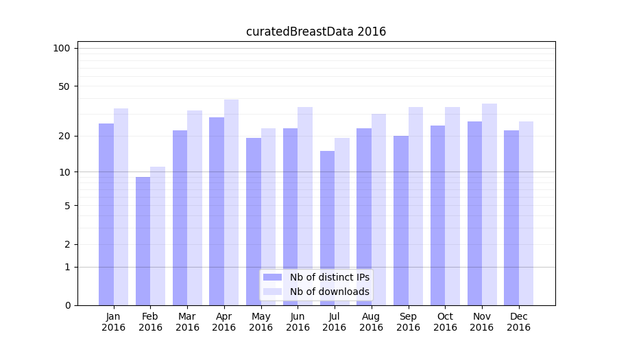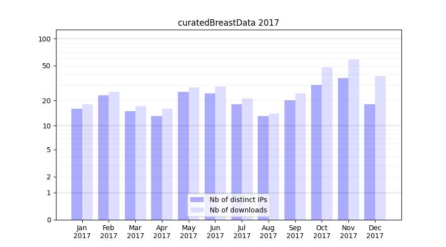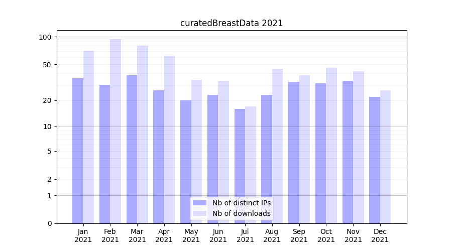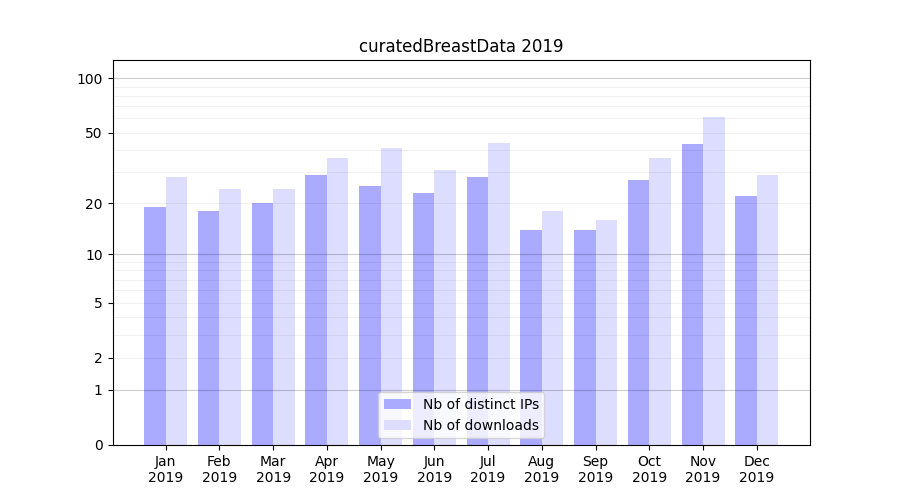 Number of downloads for experiment package curatedBreastData, year by year, from 2025 back to 2014 (years with no downloads are omitted):