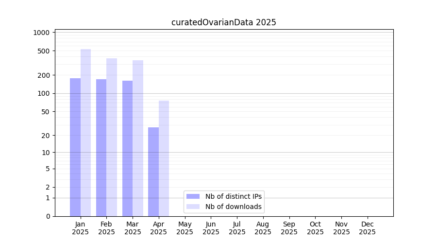 Number of downloads for experiment package curatedOvarianData, year by year, from 2025 back to 2014 (years with no downloads are omitted):