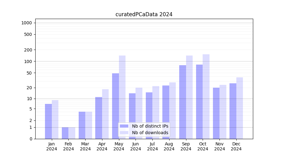 Number of downloads for experiment package curatedPCaData, year by year, from 2025 back to 2014 (years with no downloads are omitted):