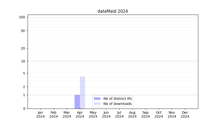 Number of downloads for experiment package dataMaid, year by year, from 2025 back to 2014 (years with no downloads are omitted):