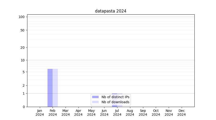 Number of downloads for experiment package datapasta, year by year, from 2025 back to 2014 (years with no downloads are omitted):