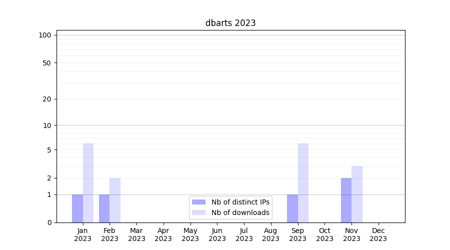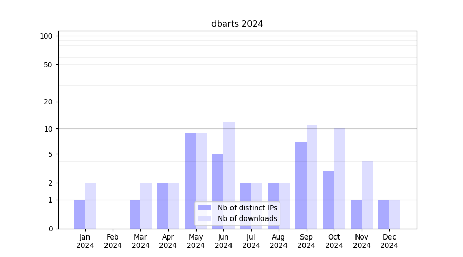 Number of downloads for experiment package dbarts, year by year, from 2025 back to 2014 (years with no downloads are omitted):