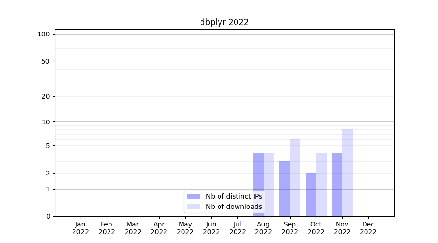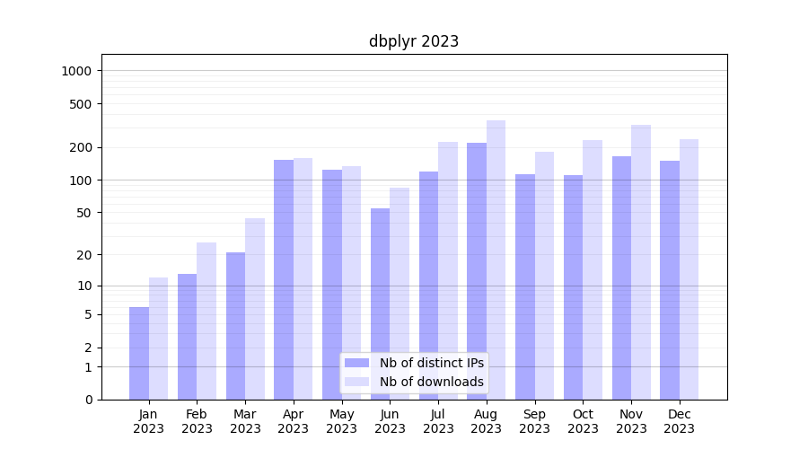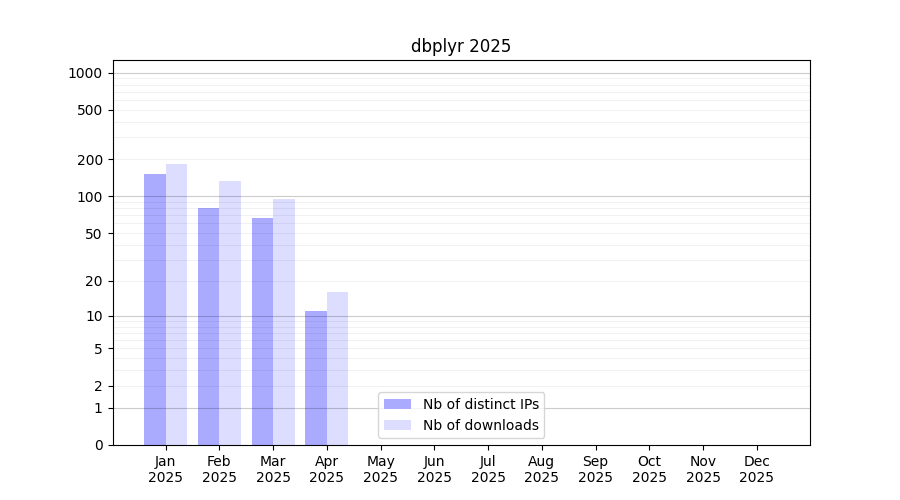 Number of downloads for experiment package dbplyr, year by year, from 2025 back to 2014 (years with no downloads are omitted):